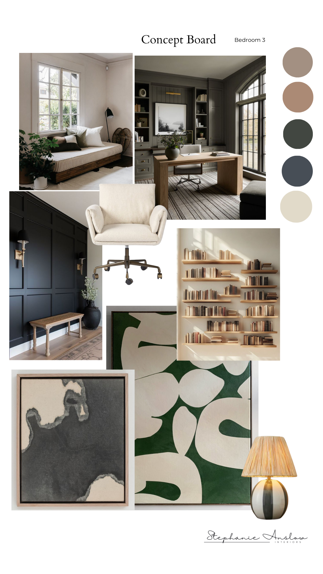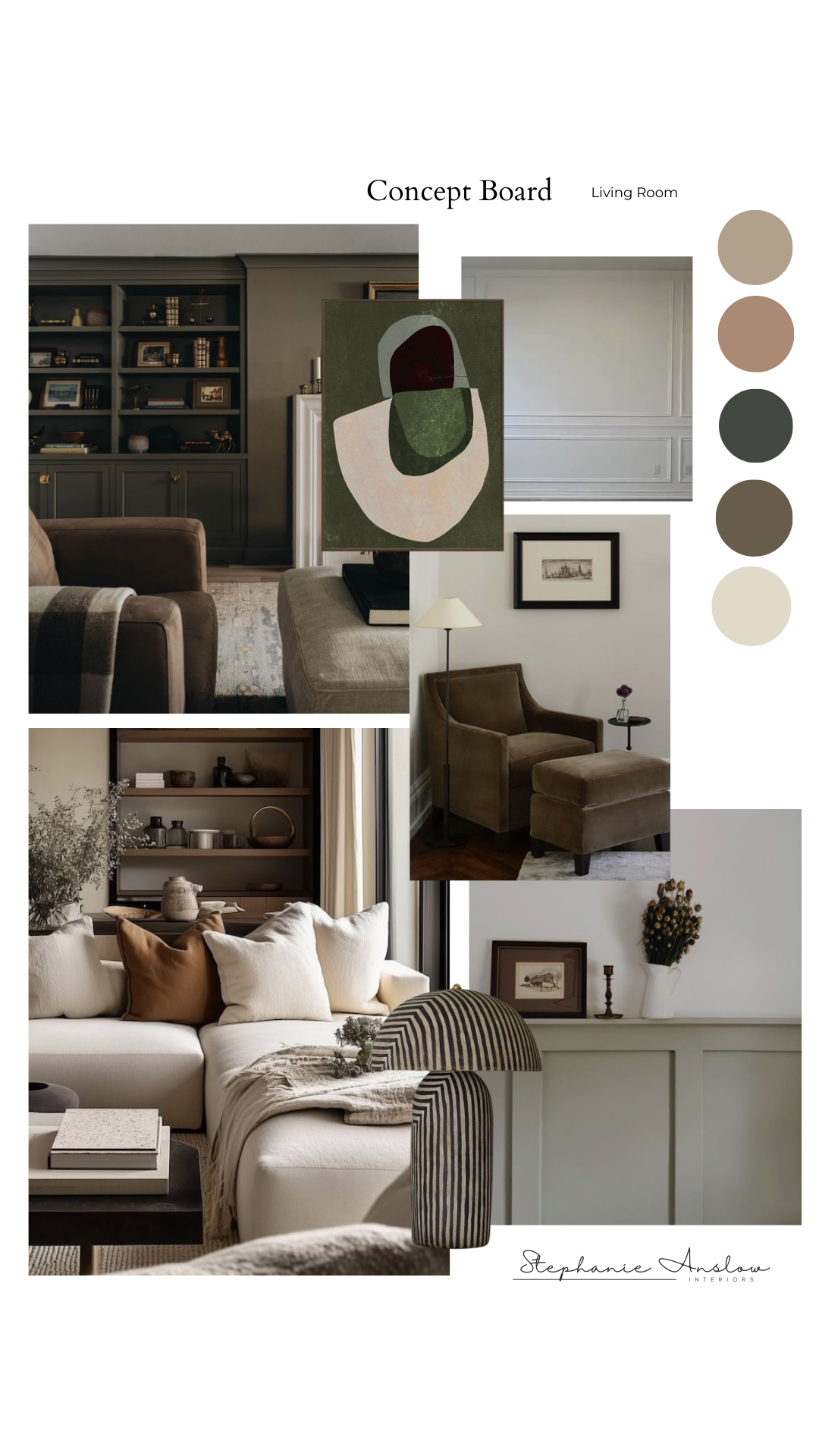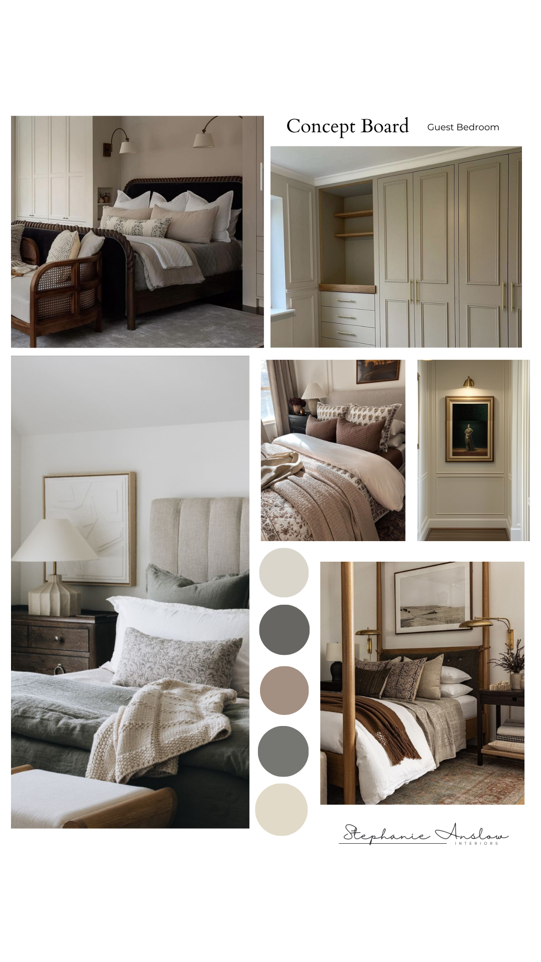 Moodboards for living room, bedrooms and home office, balancing warmth, function and timeless style across the home.